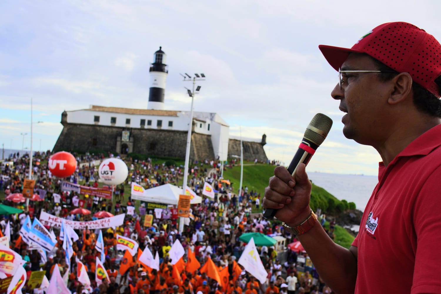 Dirigentes do Partido dos Trabalhadores da Bahia e as centrais sindicais – União Geral dos Trabalhadores da Bahia (UGT), Central dos Trabalhadores e Trabalhadoras do Brasil (CTB), Central Única dos Trabalhadores (CUT), Força Sindical e Nova Central Sindical – participaram neste domingo, 1, da comemoração ao Dia do Trabalhador, no Farol da Barra, em Salvador. No ato, que reuniu milhares de pessoas, o partido e os organizadores reafirmaram a luta em defesa dos trabalhadores, destacaram a retomada do governo democrático com a eleição de Lula e defenderam os avanços das pautas da categoria.