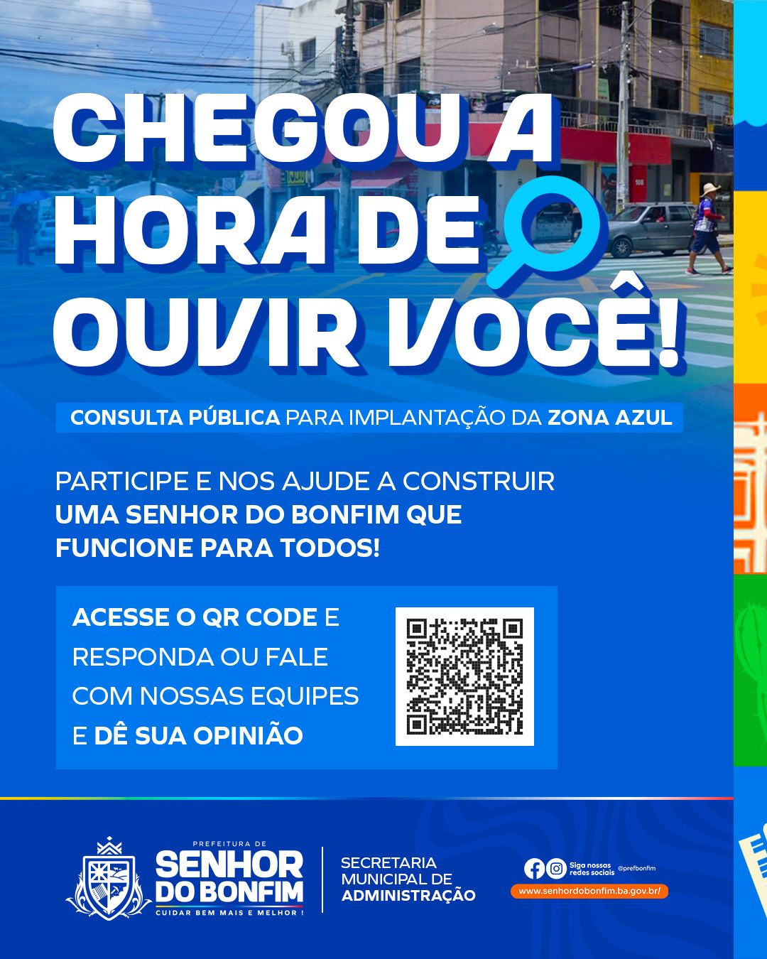 A Prefeitura de Senhor do Bonfim, por meio da Secretaria de Administração, iniciou uma consulta pública para ouvir a população sobre a proposta de reimplantação do sistema de estacionamento rotativo Zona Azul na cidade. A iniciativa atende ao encaminhamento da Audiência Pública realizada pela gestão municipal no dia 28 de março, ocasião em que ficou definido que a Secretaria de Administração ouviria a população bonfinense antes de qualquer medida sobre o tema.